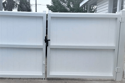 These are similar to roll gates but provide more aesthetics and the option to add an automatic opener. Cantilever gates roll smooth and are great for an area that isn’t flat where a roll gate wouldn’t roll over. Available in wood and vinyl styles.
